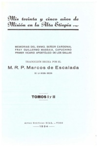 ..¡ Mis treinta y cin co años de Misión en la Al ta Eti opía ---~------ bi ernos de Europa y otros nubles personajes , de quien es esperaba ayuda para el mejoramiento de su Misión. Por otra parte, no Célrece de interés; pues además de la amenidad que rebosan sus descripciones, y de la hil aridad, gusto y satisfacción que suscitan muchos de sus episodios (tan to que si no fuera por la f e que se merece la autoridad acreditada del historiador, creeríamos se trataba de 11na novela, en la que campeaba la inventiva más aguda que darse puede), ofréce11os tanta riqueza y originalidad de datos historicos, geógráficos y climatológicos de aquellos países, q11e son muy de estimar para cuantos se precian de eruditos y ansían reu11ir 1mteri ales para tejer la histori a completa de aquellas lejanas tierras. No me juzguen por tanto mis lecto– res imprev isor ni preocupado por cosas fútil es o de poca monta, porque haya empleado mis ratos de ocio en traducir una obrn, que quizás no la lea nadie; au11que así fuera, merecía la pena de hallarse vertid11 a n11es– tra lengua esta obra, que puede contribuir a la propagación y exa ltaci ón de la fama de santidad de su au tor, y así apresu rar su elevac ión a los al – ta res. honor éd que le hacen acreedor sus heroicas y singul ares virtudes . En b traducción he querido más bien atenerme casi siempre a la lite– ra l , si .:suiendo paso a paso el pensamiento original y aun la expresión por temo r de no reflejar bien al vivo la idea que el au tor inten t aba expresar. Bueno hubier:=i si do dar mayor sol tura al leng11aje y viveza a la expre– sión ; pero perdería así en el encan to y sencillez del abuelito, que fami – li .mnente y za parrastrando va con tándonos sus peripecias y vicisitudes . recogiendo con vacilante memori a los episodios y anécdotas de su azarn– sn vida, unas veces graciosas y deleitables , y otras desagradables y re– p11lsivas, ora ed ificantes y conmovedoras, ora odiosas y repugnantes . De todo apélrece muestra en esta interesante relación; pero también sobre– nada siempre la exquisita prudencia del histori ador para no herir los no– bles y delicados sentimientos de sus lectores. En cuanto a la escritura de nombres propios , ya de personas y a de puebl os y territorios, he procurado seguir la ortografía castell ana, evi– tundo la reduplicación de letras poco usada en nuestra lengua. Por último, como para la mayoría de los lectores será desconoci da la personalidad del Cardenal M assaia , pongo aquí una brevísin-,a reseña de su vi da , at eniéndome casi únicamente a los datos históricos que de él nos da el «A na lecta O . M. C .» en la memoria necrológica que publi có . EL CARDENAL MASSAIA SUS PRIMEROS AÑOS El eminentísimo Príncipe de la Iglesia , Ca rdenal F. Guillermo Mas– saia nació en Piová, poblaci ón de la diócesis de Casal en la provincia de Asti, el día 9 de Julio de 1809, de honesta y acaudalada fami lia. Recibió las aguas bautismales con el nombre de Lorenzo, y pasó el t iempo de la infancia en su pueblo natal al lado de sus padres; pero, m11y joven aun, fué llevado a la ciudad de Asti por un hermano suyo, ca nónigo Chantre de la catedral, bajo cuya dirección aprendió las primeras letras. Muerto