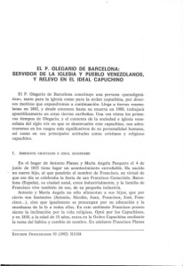 EL P. OLEGARIO DE BARCELONA: SERVIDOR DE LA IGLESIA V PUEBLO VENEZOLANOS, V RELEVO EN EL IDEAL CAPUCHINO El P. Olegario de Barcelona constituye una persona «paradigmá– tica», tanto para la iglesia como para la orden capuchina, por diver– sos motivos que expondremos a continuación. Llega a tierras venezo– lanas en 1842, y desde entonces hasta su muerte en 1900, trabajará apostólicamente en estas tierras caribeñas. Una vez vistos los prime– ros tiempos de Olegario, y el contexto de la sociedad e iglesia vene– zolana del siglo xrx en que se desenvuelve este capuchino, nos aden– traremos en los rasgos más significativos de su personalidad humana, así como en sus principales actitudes como cristiano y religioso capuchino. J. AMBIENTE CRISTIANO E IDEAL MISIONERO En el hogar de Antonio Planas y María Ángela Pasquets el 4 de junio de 1815 tiene lugar un acontecimiento entrañable. Ha nacido un nuevo hijo, al que pondrán el nombre de Francisco, en virtud de que ese día se celebraba la fiesta de san Francisco Caracciolo. Barce– lona (España), su ciudad natal, crece industrialmente, y la familia de Francisco vive también de eso, de su pequeña industria. Antonio y María Ángela no sólo alimentan a sus hijos, que por cierto son bastantes (Antonio, Nicolás, Juan, Francisca, José, Fran– cisco... ), sino que igualmente se preocupan por su educación y la enseñanza de la fe a todos ellos. En este ambiente Francisco pronto siente la inclinación por la vida religiosa. Optó por los Capuchinos, y en 1830, a la edad de 15 años, entra en la Orden Capuchina mediante la toma del hábito y cambio de nombre. En adelante Francisco Planas ESTUDIOS FRANCISCANOS 93 (1992) 313-334