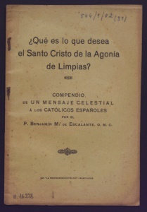 ¿Qué es lo que desea pe | el Santo Cristo de la Agonía | de Limpias? 000 ] COMPENDIO. _ De UN MENSAJE CELESTIAL A Los CATÓLICOS ESPAÑOLES POR EL -—P. BENJAMÍN M:' pe ESCALANTE, O. M. C. AMP, "LA PROPAGANDA CATÓLICA".—8 ANTANDER > *