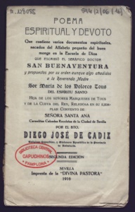 r. años AULlo6 (4) POEMA ESPIRITUAL Y DEVOTO Que contiene varios documentos espirituales, sacados del Alfabeto pequeño del buen monge en la Escuela de Dios QUE ESCRIBIÓ EL SERÁFICO DOCTOR SAN BUENAVENTURA y propuestos por su orden aunque algo añadidos a la Reverenda Madre Sor María de los Dolores Tous DEL ESPÍRITU SANTO HIJA DE LOS SEÑORES MARQUESES DE Tous Y DE LA CUEVA DEL REY, RELIGIOSA EN SU EJEM- PLAR CONVENTO DE SEÑORA SANTA ANA Carmelitas Calzadas Recoletas de la Ciudad de Sevilla POR EL BTO, DIEGO JOSÉ DE CADIZ pucbino, y Mistonero Mpostólico de la Provincia SEVILLA Imprenta de la “DIVINA PASTORA“ 1916