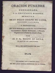 nO (CORACION FUNEBRE CONSAGRADA ÁLA EDIFICANTE MEMORIA DEL M. R. Y Y. P. FRAY DIEGO JOSEPH DE CADIZ, MISIONERO CAPUCHINO, Y PRONUNCIADA EN SUS HONRAS ANTE EL ILUSTRISIMO Ayuntamiento , Cabildo Eclesiastico , y Prelados Regulares de la Ciudad de Alcalá la Real, POR EL P. Fr. JOSEPH DE OSUNA, GUARDIAN DE CAPUCHINOS. DIA y9 DE SEPTIEMBRE DE 1801, Ds<y EN CORDOBA : EN LA IMPRENTA REAL DON JUAN GARCIA RODRIGUEZ DE LA TORRE, Jo