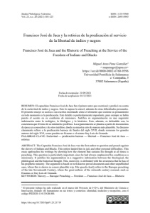 Studia Philologica Valentina ISSN: 1135-9560 Vol. 23, n.s. 20 (2021) 103-125 e-ISSN: 2695-8945 https://doi.org/10.7203/SphV.23.21719 Francisco José de Jaca y la retórica de la predicación al servicio de la libertad de indios y negros Francisco José de Jaca and the Rhetoric of Preaching at the Service of the Freedom of Indians and Blacks Miguel Anxo Pena González 1 < mapenago@upsa.es> https://orcid/0000-0002-6760-9596 Universidad Pontificia de Salamanca c/ Compañía, 5 37002 Salamanca (España) Fecha de recepción: 21/09/2021 Fecha de aceptación: 01/12/2021 RESUMEN: El capuchino Francisco José de Jaca fue el primer autor que cuestionó y predicó en contra de la esclavitud de indios y negros. Esto le supuso la cárcel, además de otras dificultades personales. El presente ensayo se acerca a sus escritos mostrando cómo el elemento que sostiene su pensamiento en todo momento es la predicación. Este detalle es particularmente importante, pues siempre se había puesto el acento en su condición de misionero. Justifica su argumentación en una sugerente imbricación entre lo teológico, lo filológico y lo histórico. Esto, además, es defendido con, la conciencia que él tiene de su ministerio profético. La argumentación se plantea a partir de documentos de época ya conocidos y de otros inéditos, donde se muestra esto de manera más plausible. Su discurso claramente refiere a la predicación barroca de finales del siglo XVII, donde resuenan los grandes autores del siglo XVI, como pueden ser Erasmo o el mismo fray Luis de Granada. PALABRAS CLAVE: Esclavitud — predicación barroca — libertad — Francisco José de Jaca — retórica ABSTRACT: The Capuchin Francisco José de Jaca was the first author to question and preach against the slavery of Indians and Blacks. This option landed him in jail, and other personal difficulties. This essay approaches his writings by showing how the element that sustains his thought at all times is preaching. This question is particularly important, since he had always emphasized his condition as a missionary. It justifies his argumentation in a suggestive imbrication between the theological, the philological and the historical thought. This, moreover, is defended with the awareness that he has of his prophetic ministry. The argument is based on well-known period documents and other unpublished ones, where this is shown in a more plausible way. His speech clearly refers to the Baroque preaching of the late Seventeenth Century, where the great authors of the sixteenth century resound, such as Erasmus or fray Luis de Granada. KEYWORDS: Slavery — Baroque Preaching — Freedom — Francisco José de Jaca — Rhetoric 1 El presente trabajo ha sido realizado en el marco del Proyecto de I+D+i, del Ministerio de Ciencia e Innovación, titulado «El humanismo en sus textos y contextos: identidad, tradición y recepción», con el código PID2020-114133GB-I00.