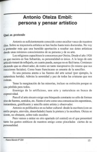 Antonio Oteiza Embil: persona y pensar artístico Qué se pretende Antonio es suficientemente conocido como escultor vasco de nuestros días. Sobre su trayectoria artística se han hecho hasta tesis doctorales. No voy a pretender más que una humilde aportación a resaltar sus dotes artísticas desde unas mínimos conocimientos de su persona y de su arte. Los religiosos capuchinos le conocemos por Oteiza. Desde el año 1926 en que naciera en San Sebastián, su personalidad es única. A lo largo de este artículo trataré de reflejarla, en cuanto pueda, aunque no es fácil tarea. Comienzo diciendo que es observador, de rostro un tanto inexpresivo (lo mismo que sus reacciones faciales). Como buen franciscano es amante de la sencillez. Es una persona atenta a las fuentes del arte actual (por ejemplo, la naturaleza herida). Admira la serenidad y paz de todas las criaturas que nos rodean. Teme la marginación de las minorías, incluso su extinción porque es una pérdida para todos. Enemigo de lo artificioso, une arte y naturaleza en busca de expresividad. Para él el arte sincero exige una búsqueda constante no sólo de formas sino de fuentes, sentidos, etc. Siente el arte como una comunicación espontánea, instantánea, gratificante y sencilla entre artista y observador. Antonio es polifacético en su haber cultural: desde la escritura (con un estilo propio, atrevido, desenfadado) hasta la pintura y la escultura. Oteiza se siente, no obstante, sobre todo escultor. Pero vamos a entrar en otro apartado (el central) en el que presentaré tanto los gustos estéticos de nuestros amigo como pinceladas ciertas de su personalidad. Nuevo Mundo Nº 204 15