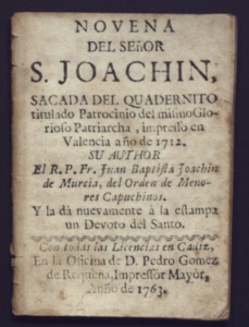 NOVENA DEL SEGOR S. JOACHIN, SACADA DEL QUADERNITO. yy titulado Patrocinio dei miimoGilos rioío Patriarcha ,inmprelo en Valencia añade 1712, SU AUTHOR El R.P.Fr. fuan Bapiifa Joachim de Murcia, del Orden de Meno- res Capuchinos. Y la da nuevamente a la eftampa un Devoto del Santo. ELISA LS= GIL LIT GITISR todas las Licencias en Cadiz, Oíñcina de D. Pedro Gomez na,Ilmpreflór Mayory de 1763»