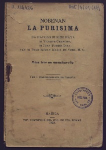 ..o» 40,3 A 5 » e e .» >> Ms po ss, 2 -AMAIO NOBENAN LA PURISIMA NA HAPOLO GI FINO HAYA S1 VICENTE CAMACHO, SI JUAN TORRES DIAZ i YAN Si PALE ROMAN MARIA DE VERA, M. C, Mina tres na manahuyoñg ' Yan i manmanesesita na lisensia. MANILA TIP, PONTIFICIA DEL COL. DE STO. TOMAS 922.